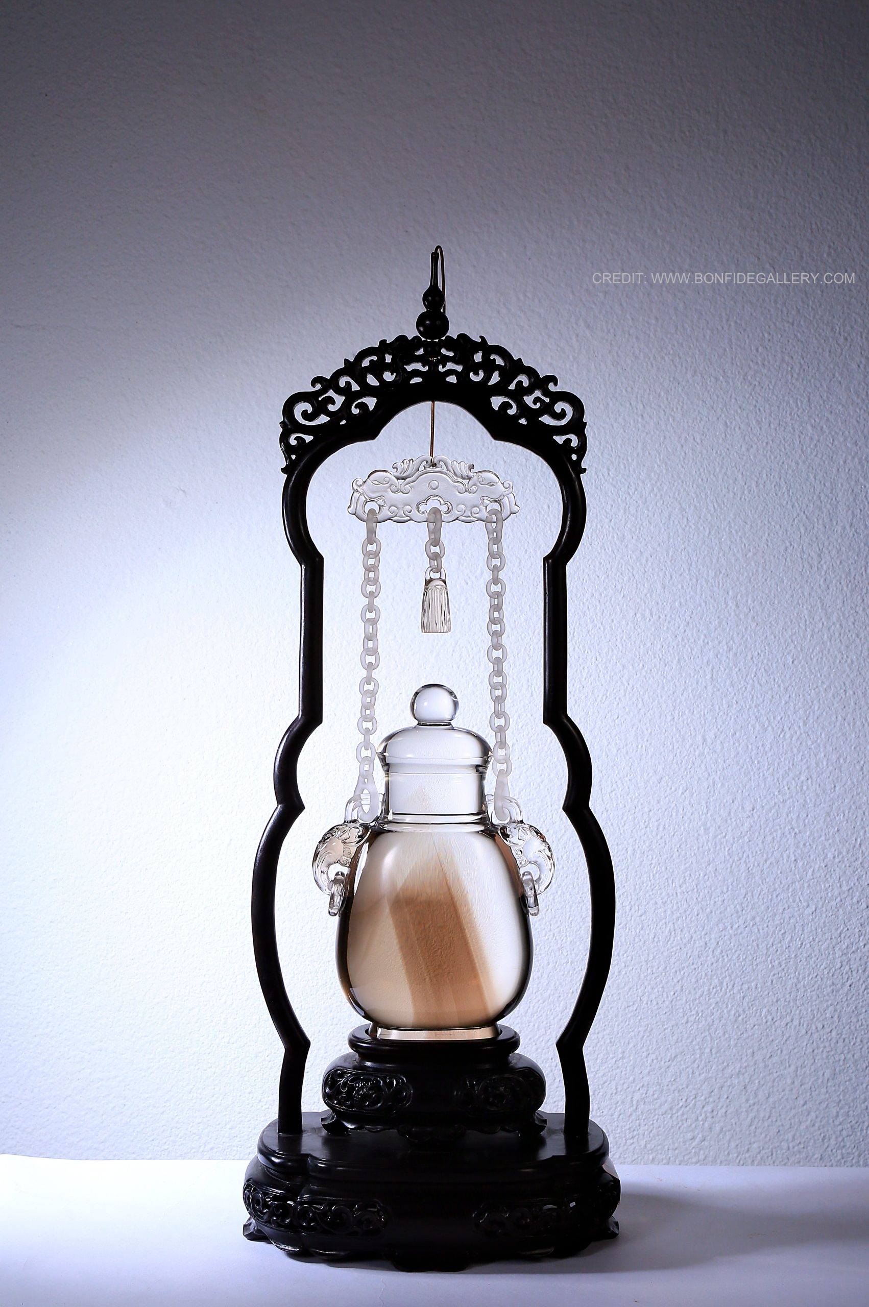 Beautiful Celestial Harmony Vessel. crystal intricate frame suspended design elegance ritualistic black and white artistry