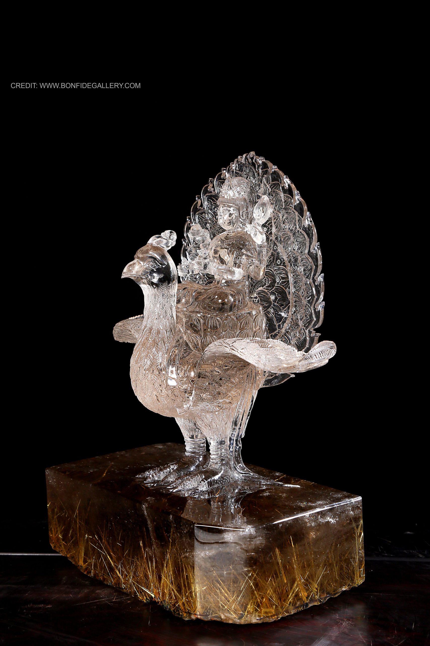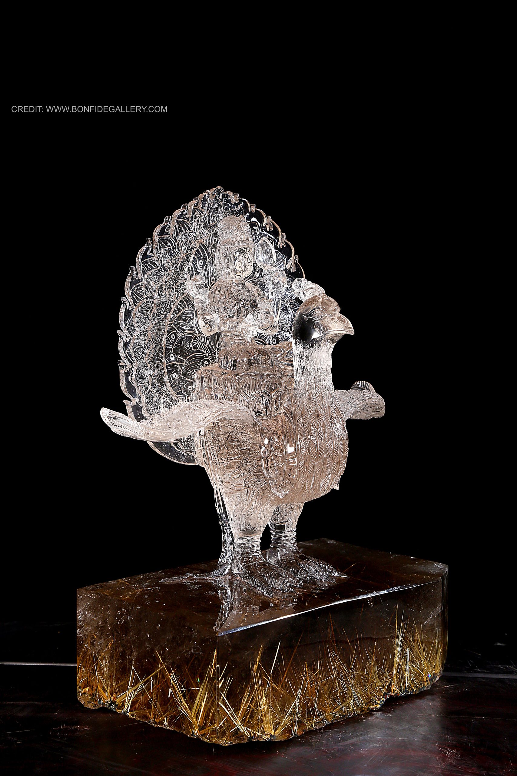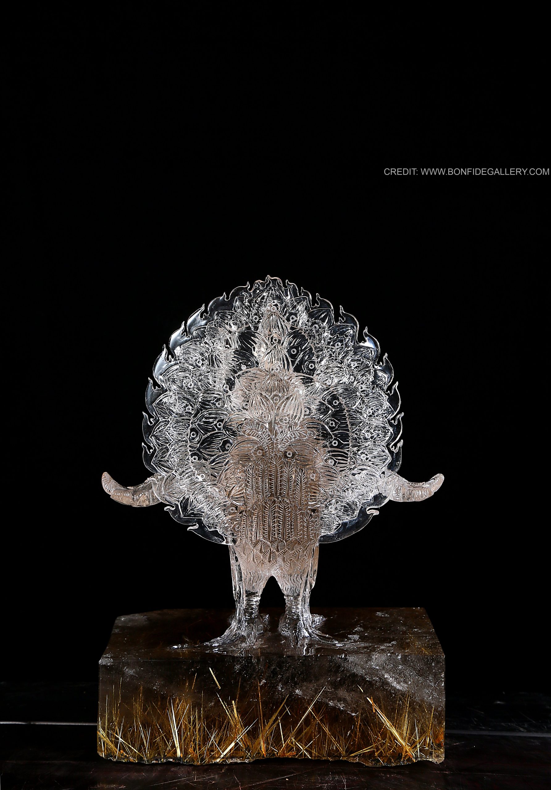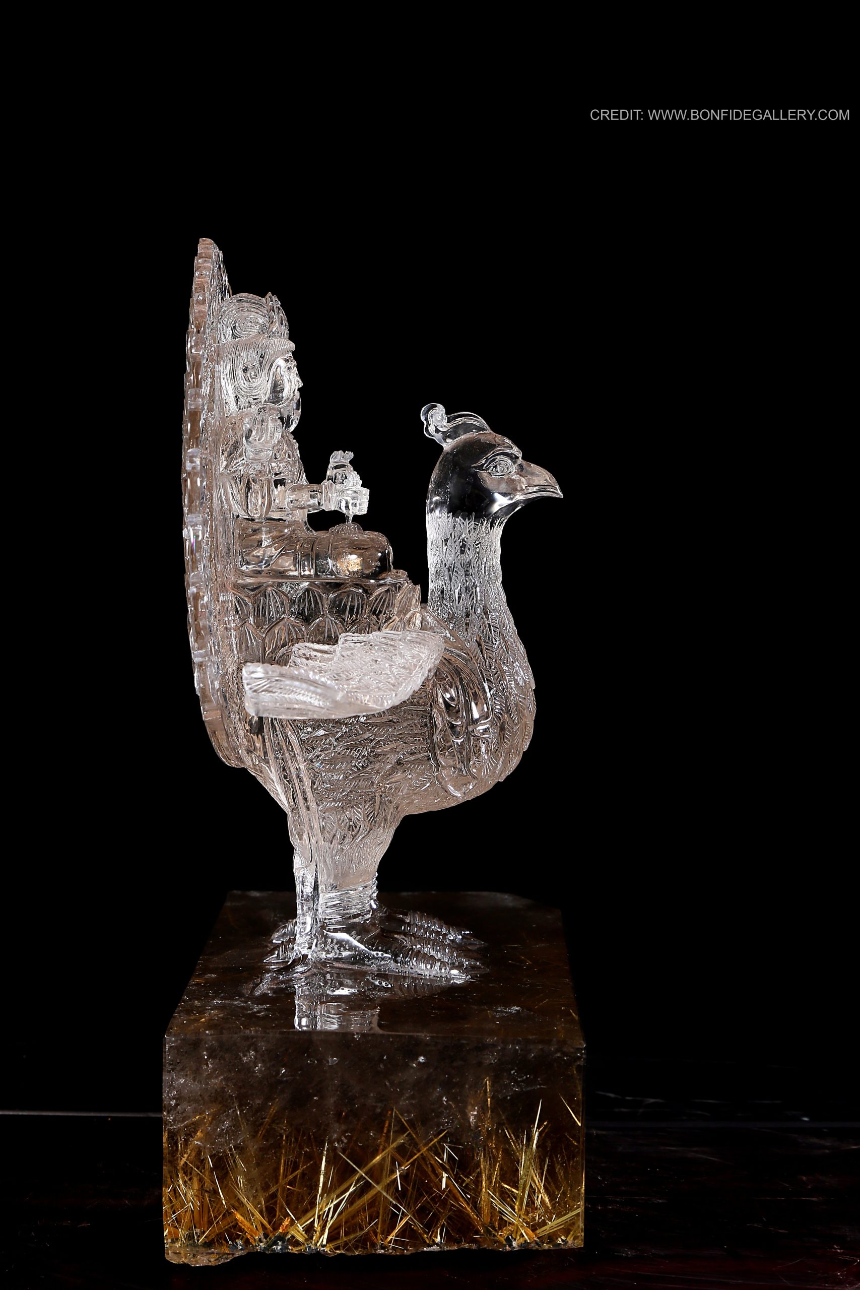 Beautiful Celestial Peacock Divinity. glass sculpture peacock divinity intricate design transparent mythology nature-inspired