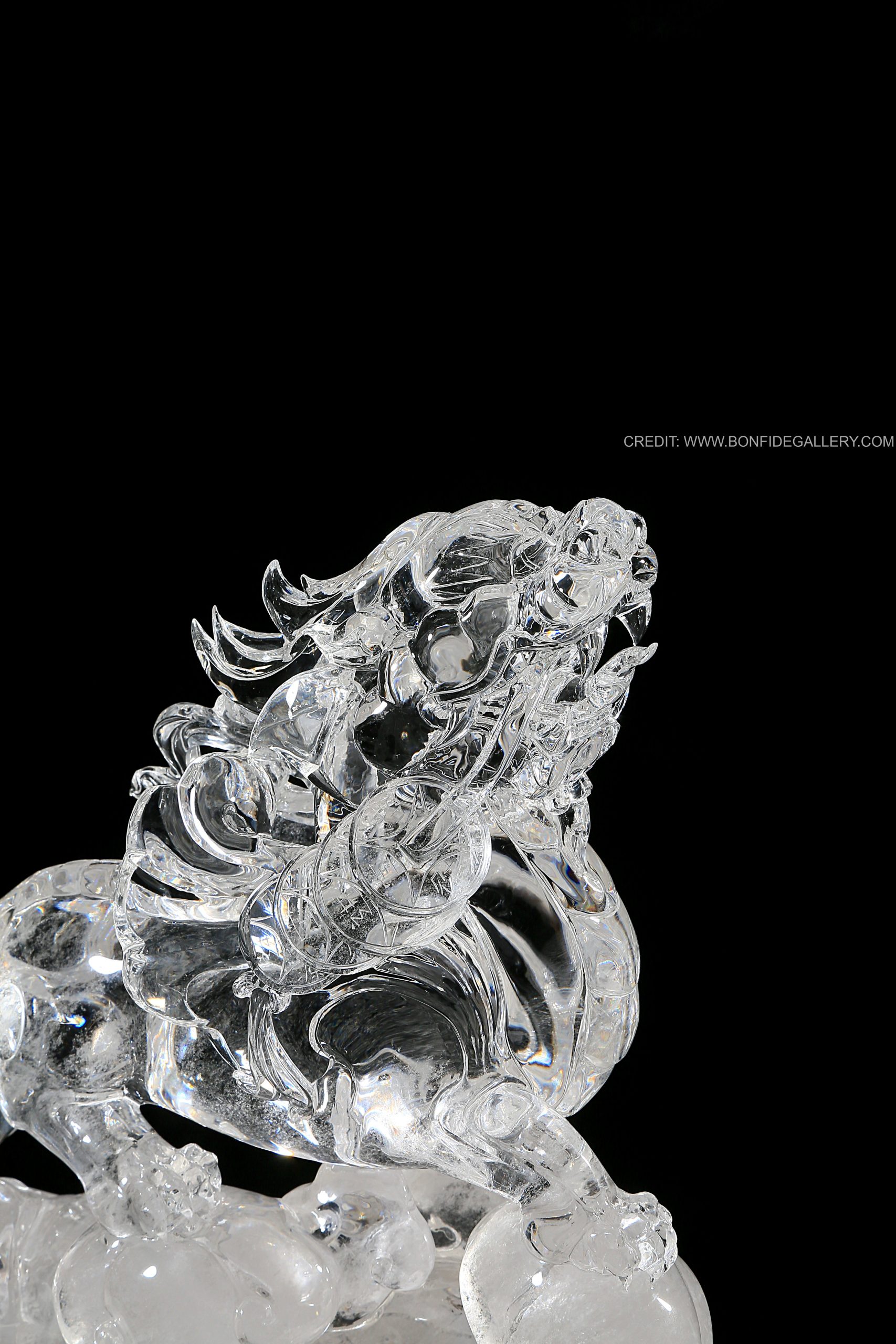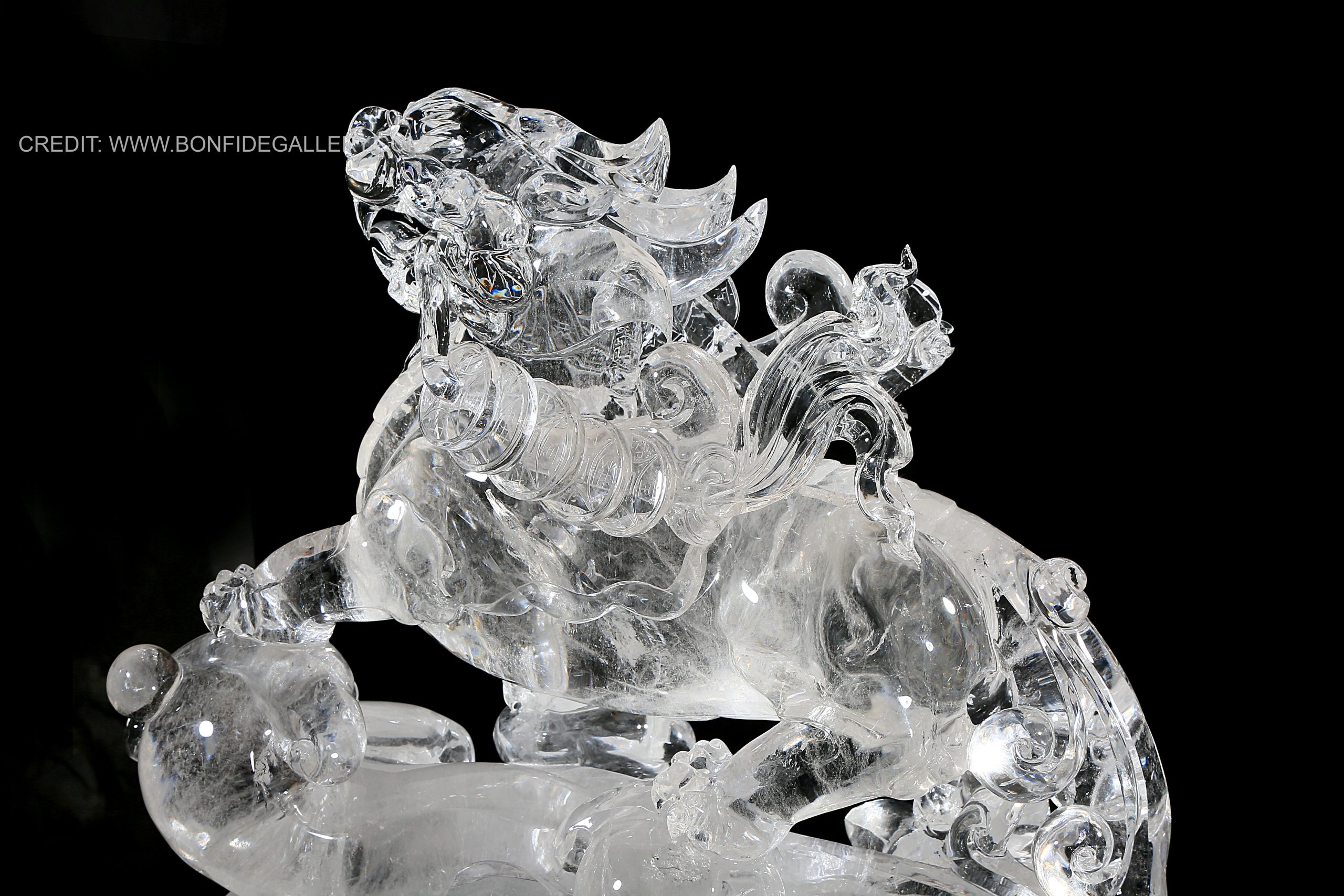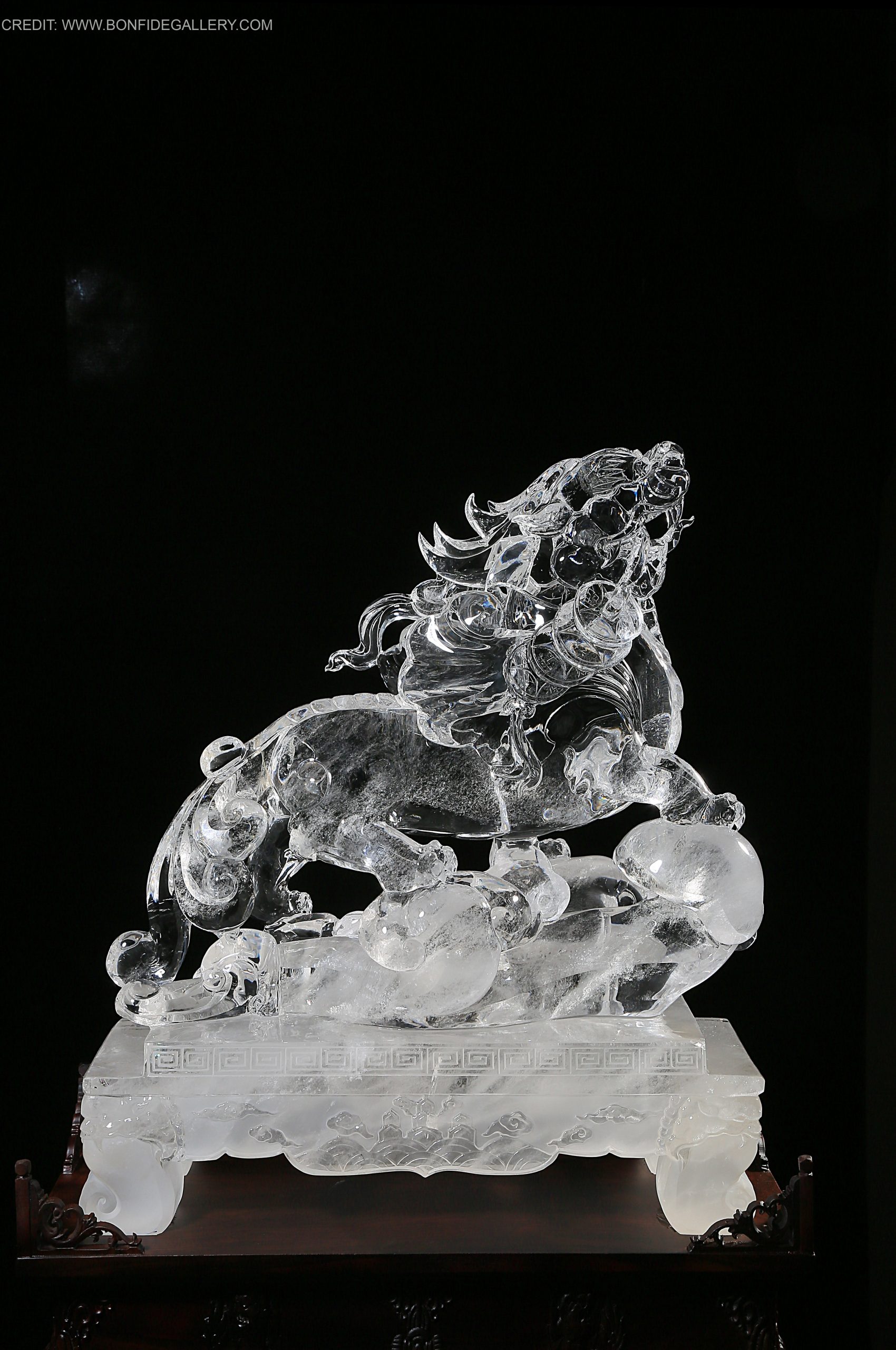 Beautiful Crystal Guardian Beast. crystal sculpture mythical creature translucent Chinese mythology decorative art ornate pedestal