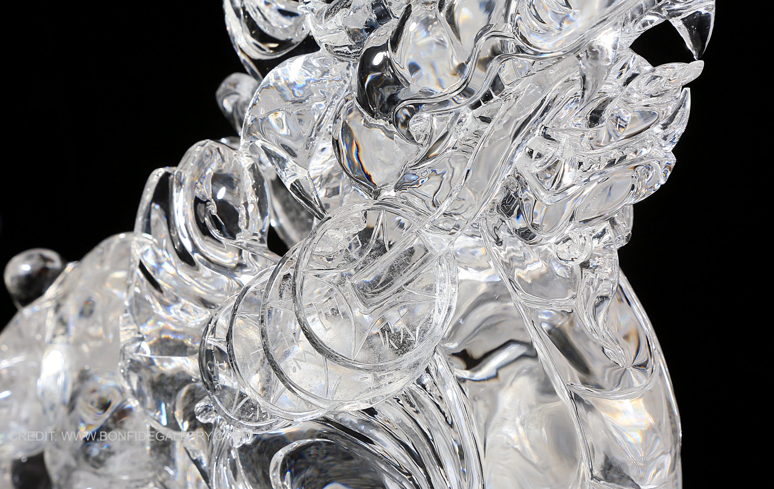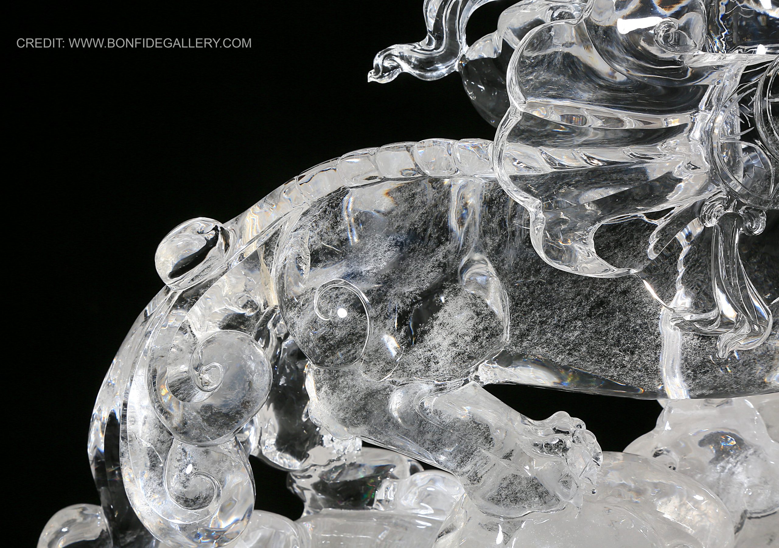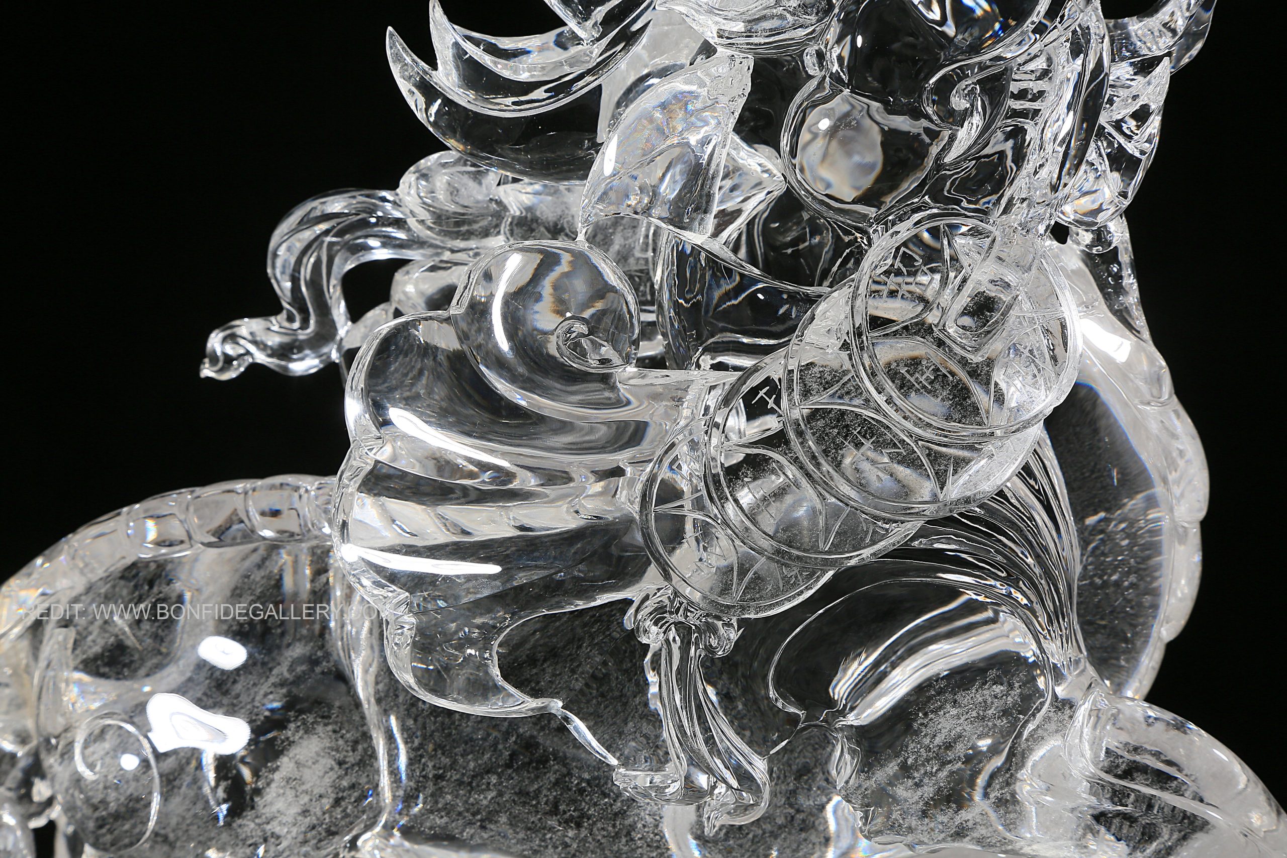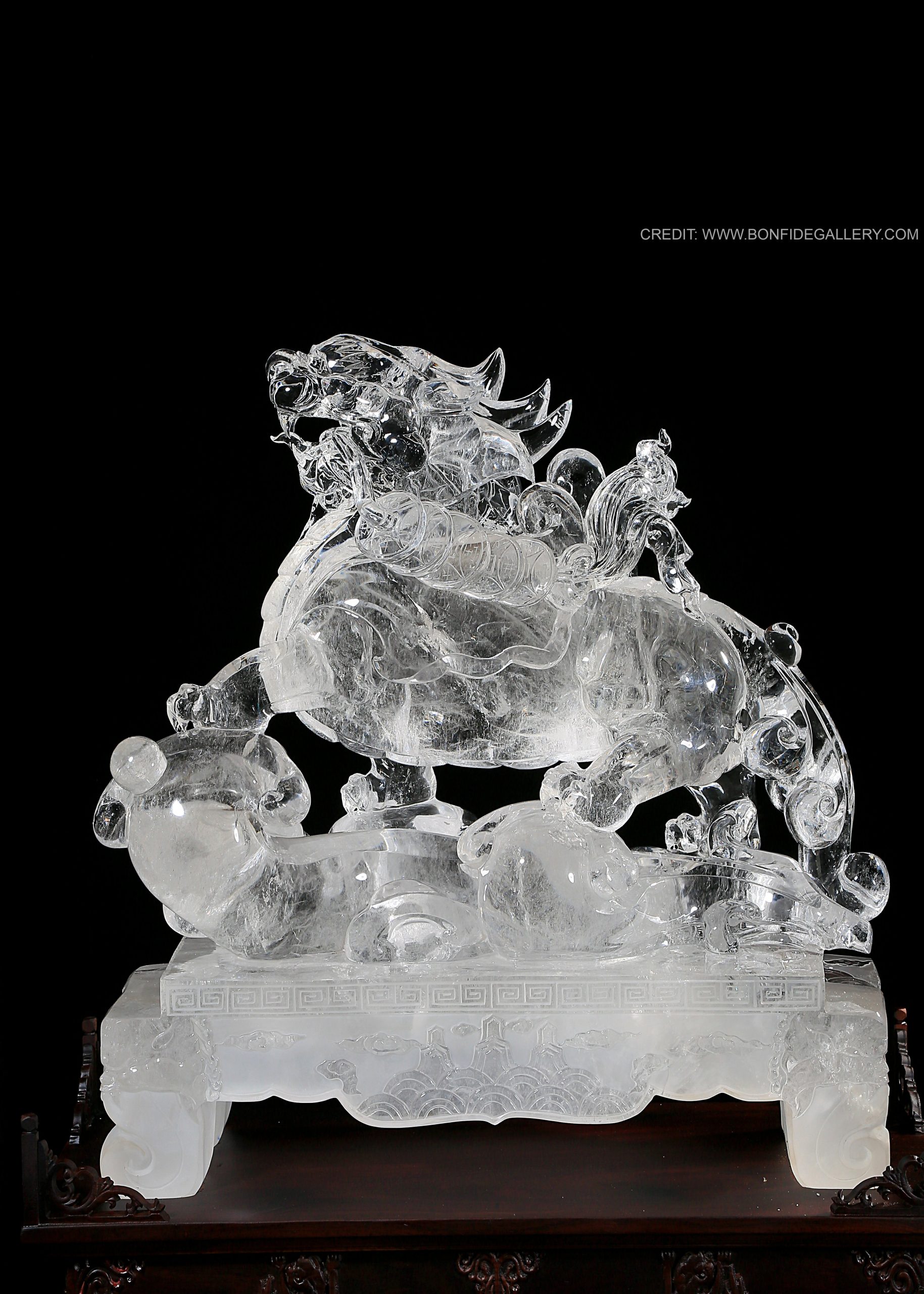 Beautiful Crystal Guardian Beast. crystal sculpture mythical creature translucent Chinese mythology decorative art ornate pedestal