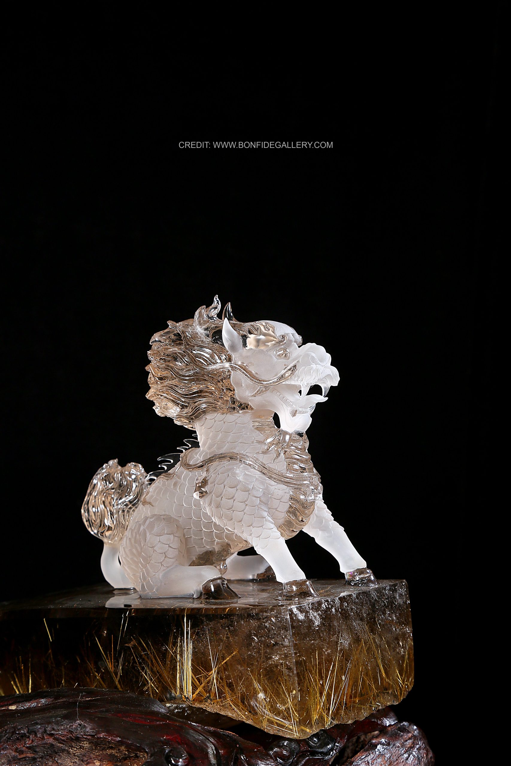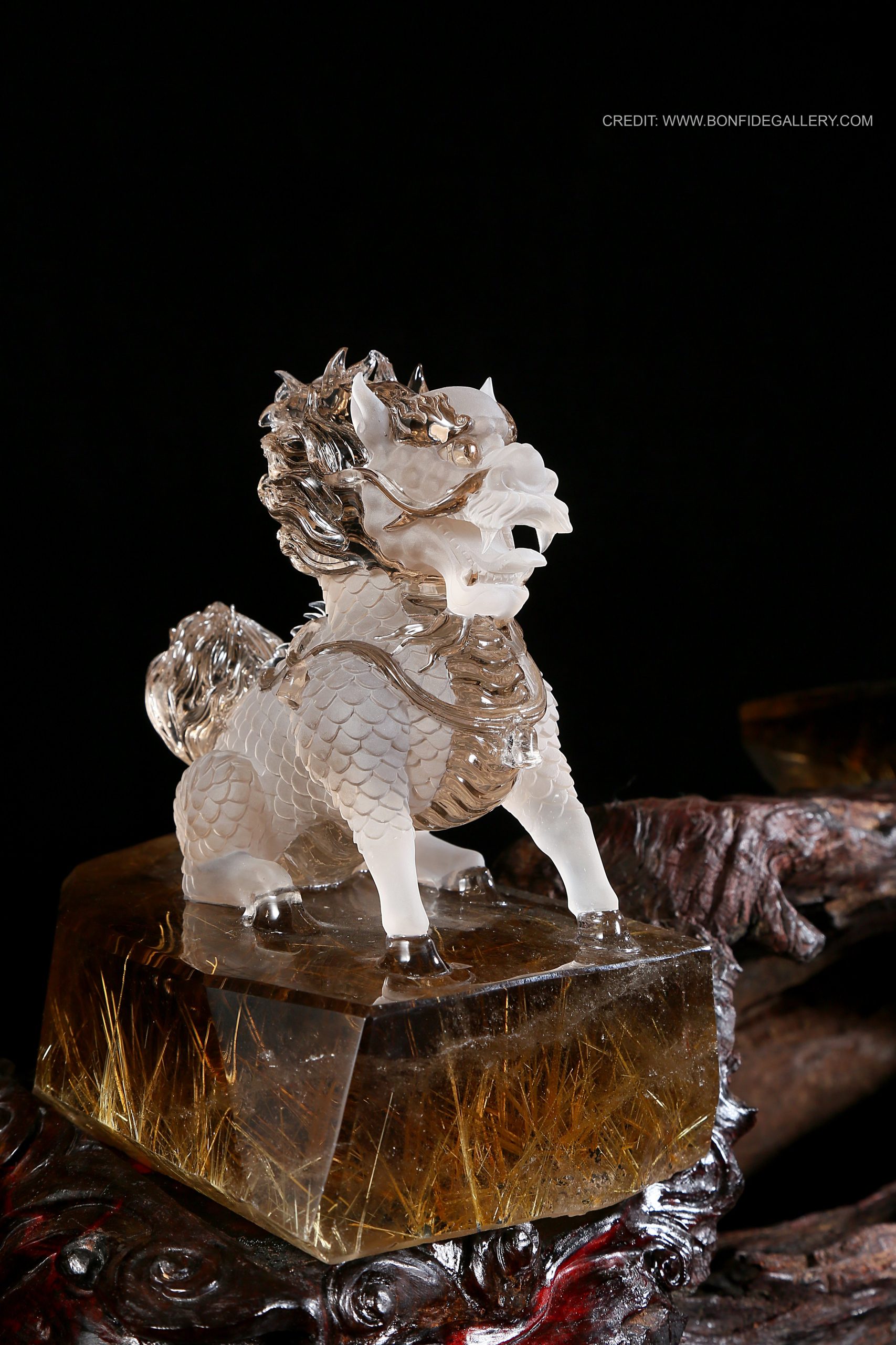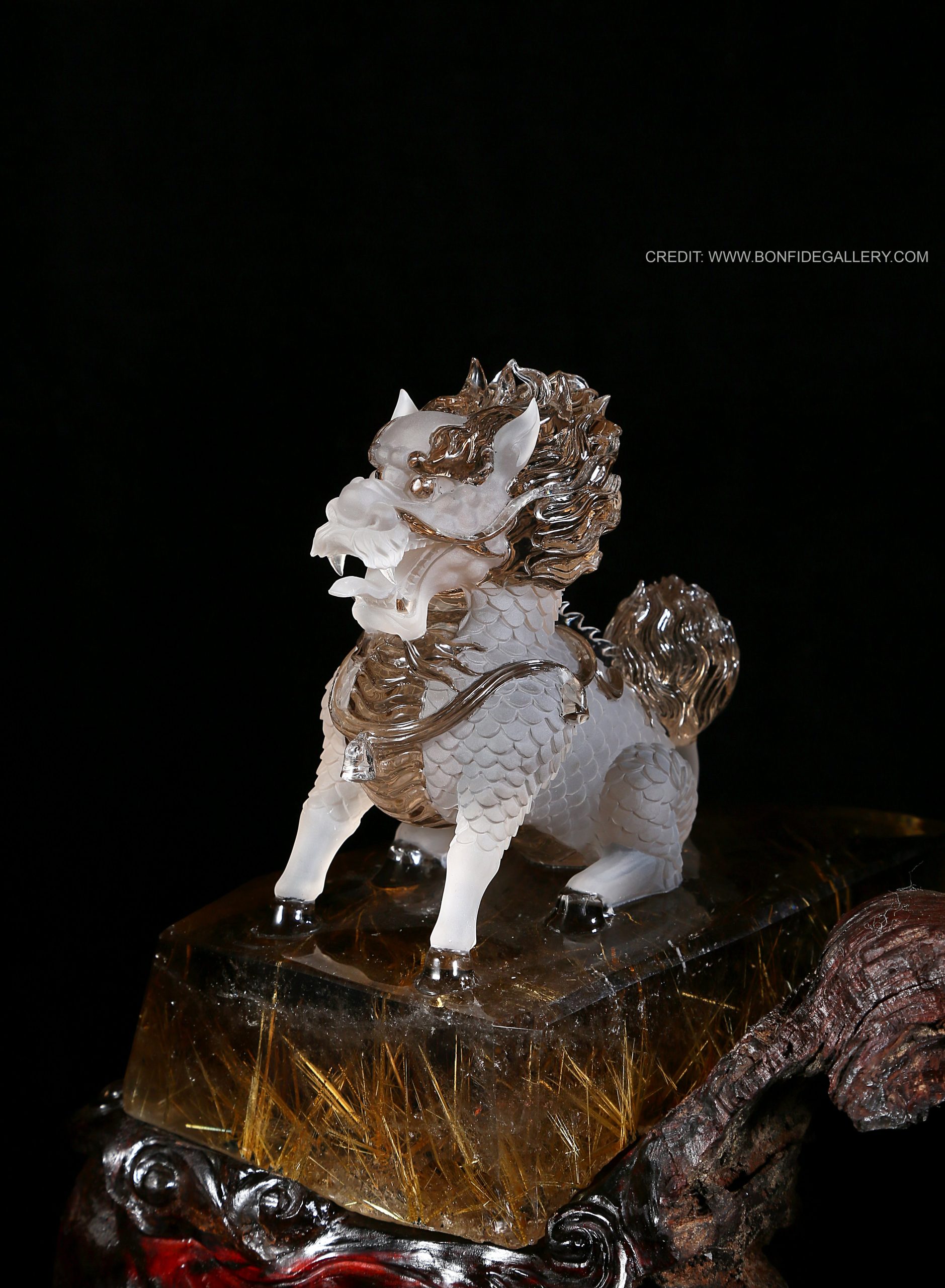 Beautiful Crystal Guardian Beasts. crystal mythical creatures sculpture guardian intricate clear wood base decorative art