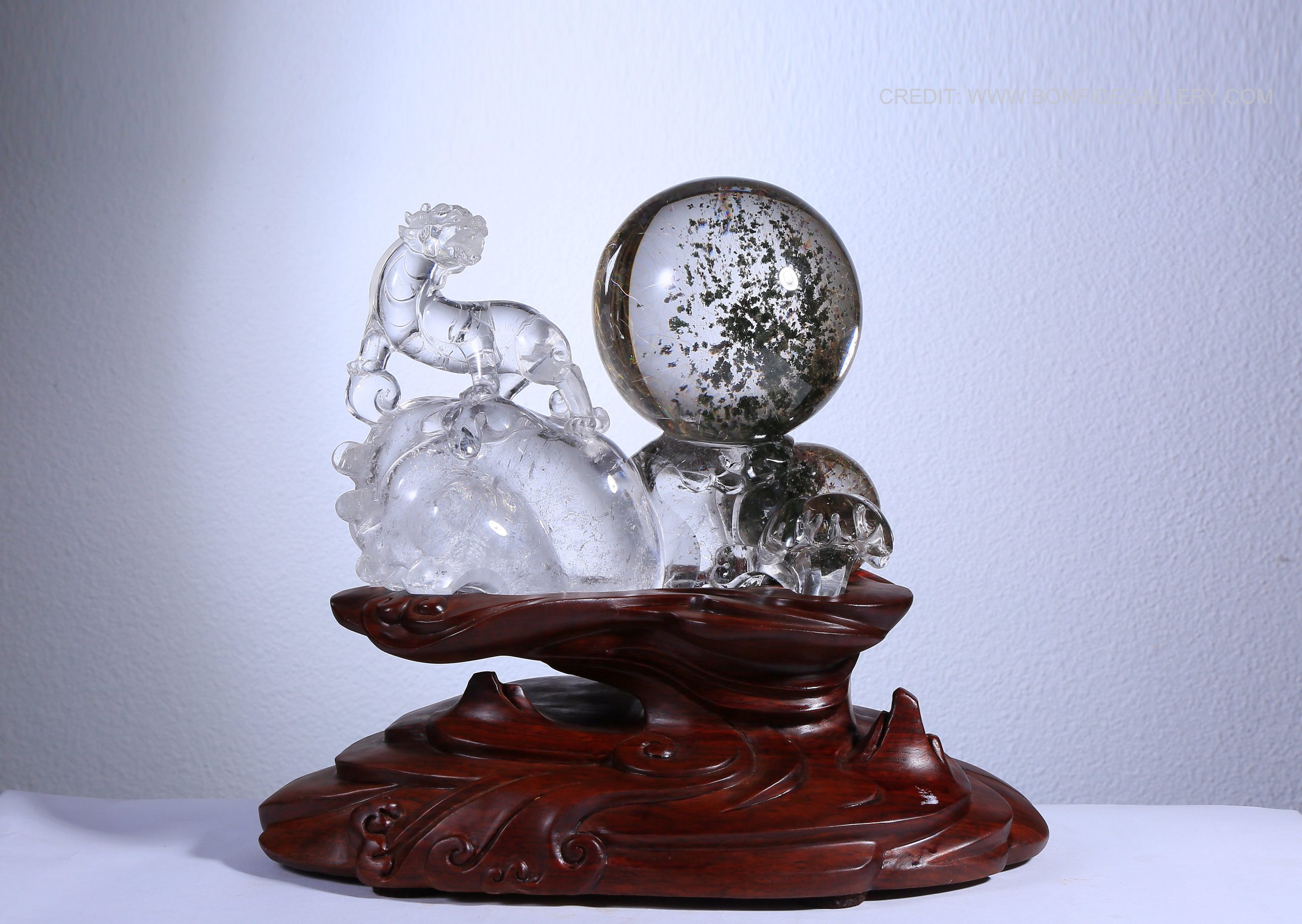 Beautiful Crystal Guardian Sphere. crystal sculpture mythical creature nature transparency wooden base art decor