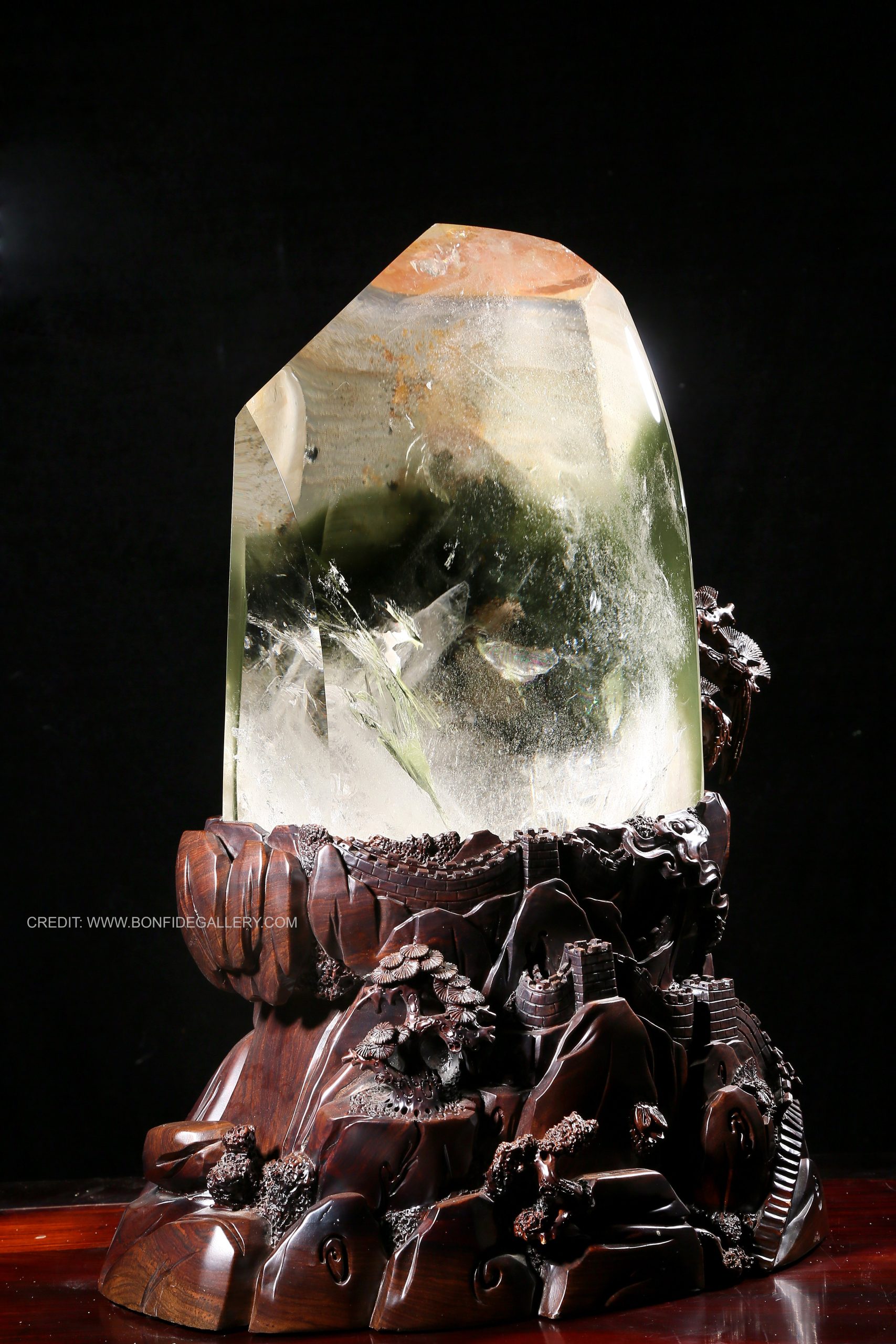 Beautiful Crystal Warrior Sentinel 1. crystal wooden base sculpture mystical guardian intricate carving nature themes