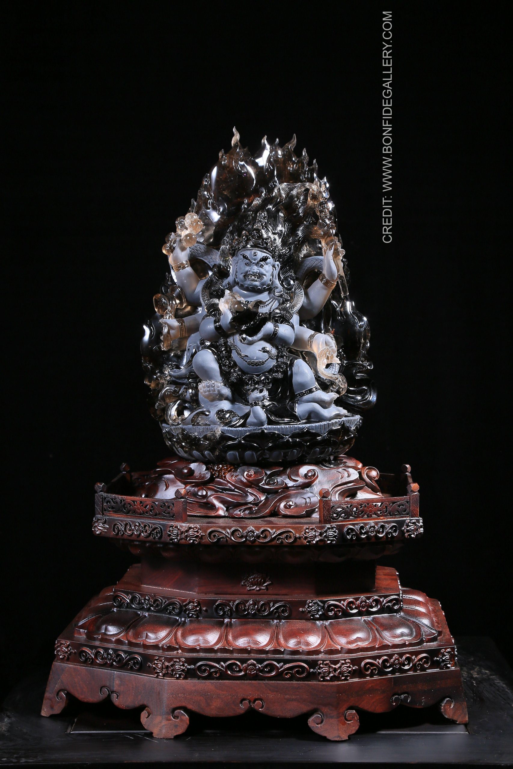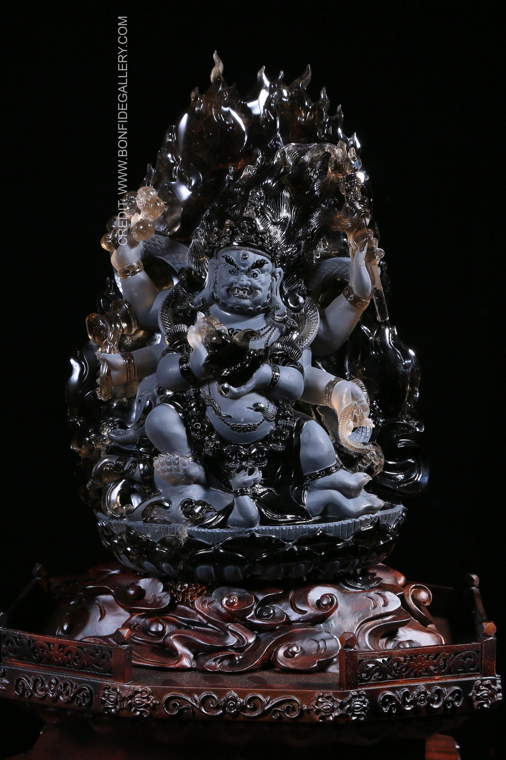 Beautiful Divine Frost Warrior. jade sculpture deity intricate carving mythology spiritual dark background wood base