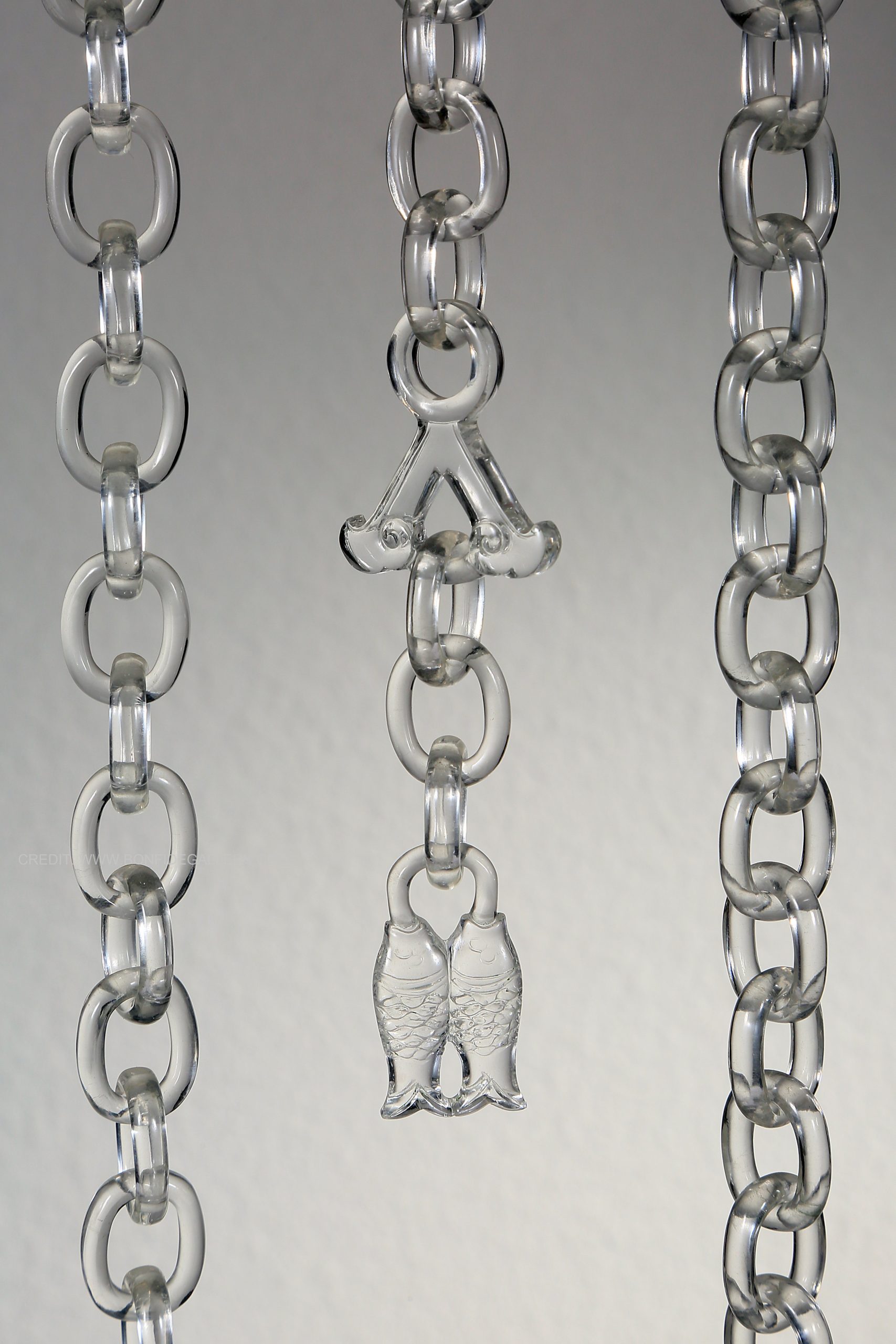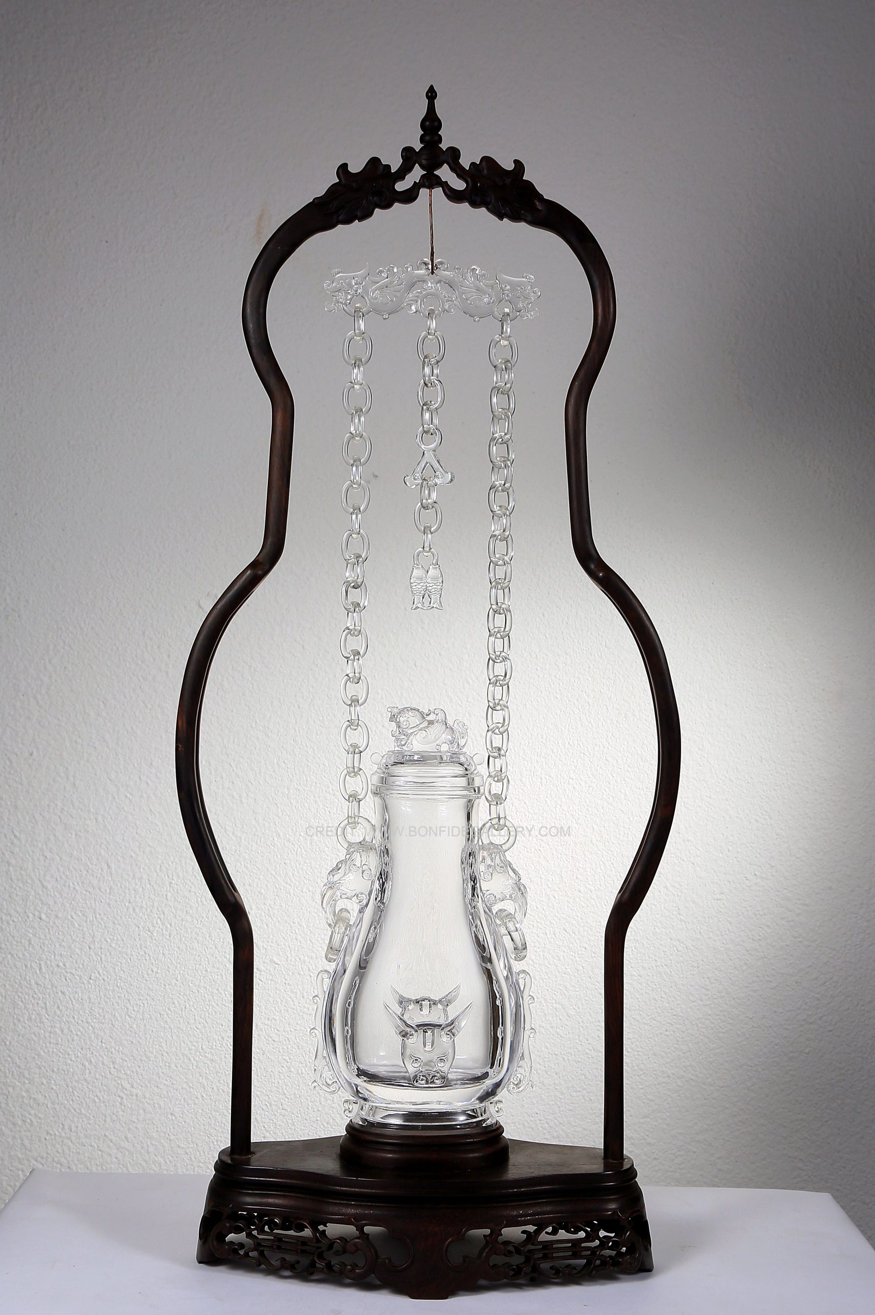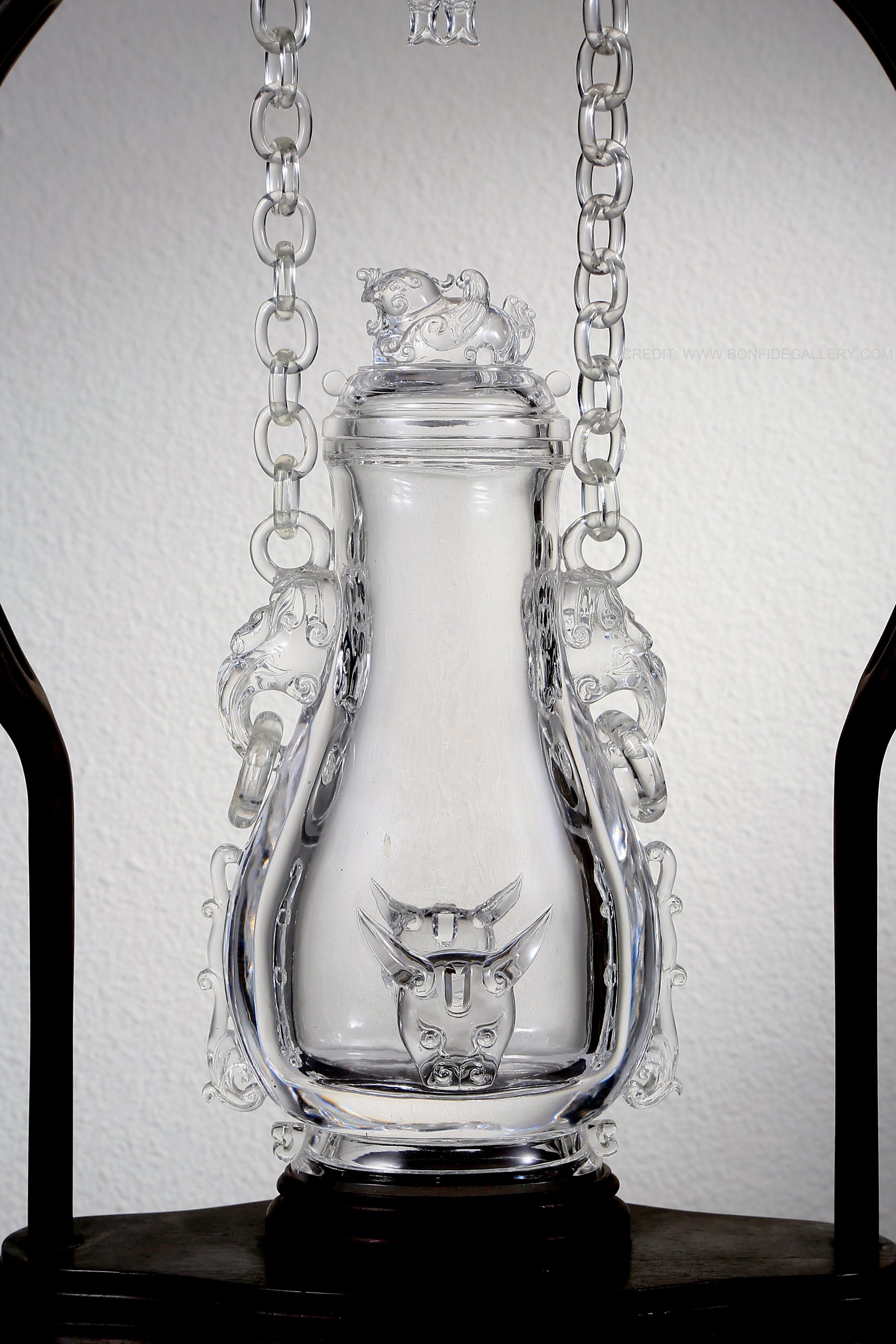 Beautiful Ethereal Crystal Vessel. glass sculpture ornate frame transparent intricate chains decorative art elegant design hanging installation contemporary sculpture