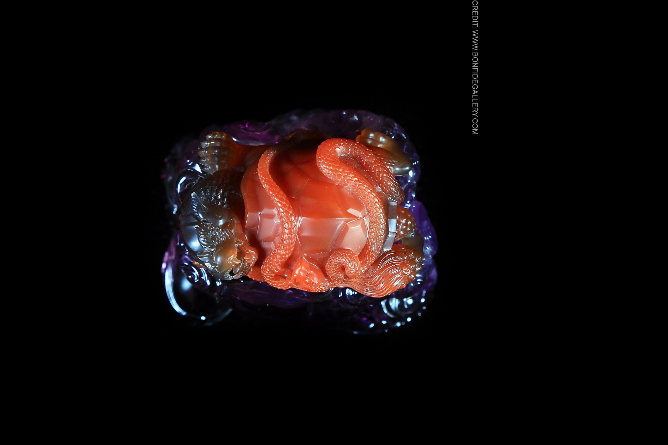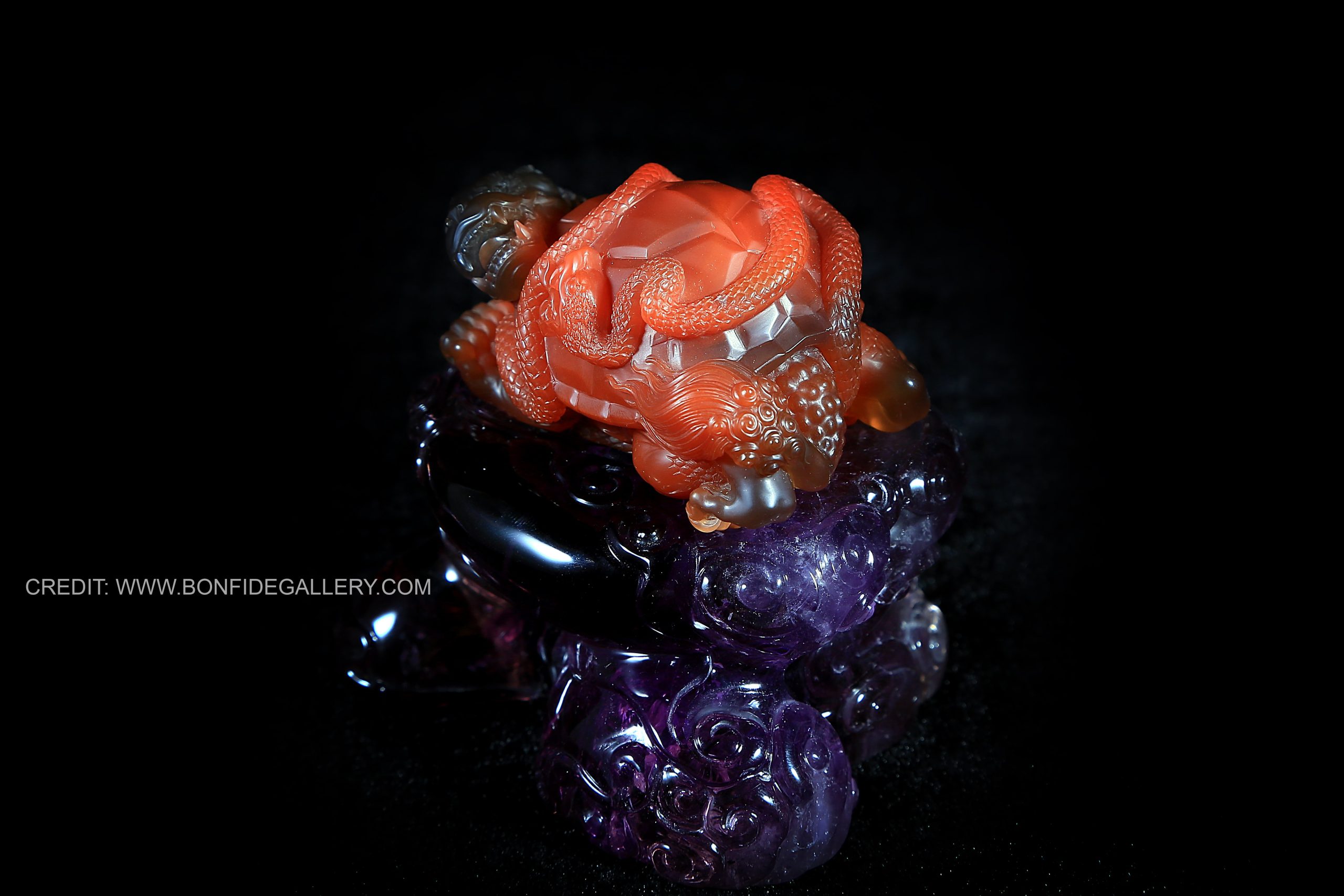 Beautiful Serpents Crystal Coils. gemstone red-orange mythical serpent intricate carving sculpture mythology lapidary art