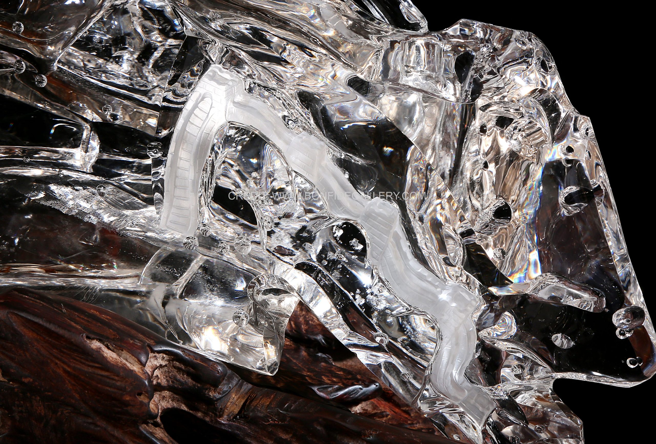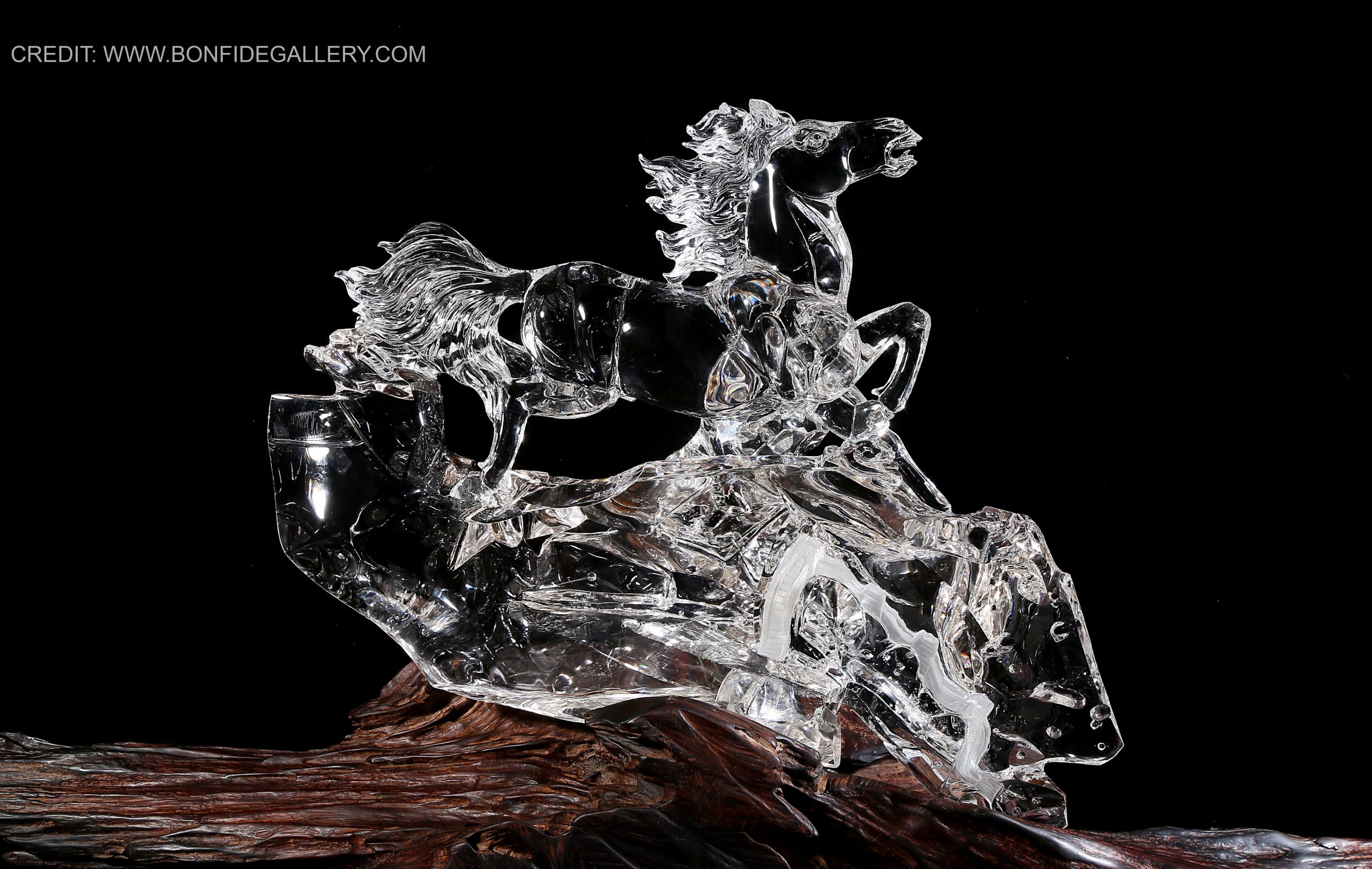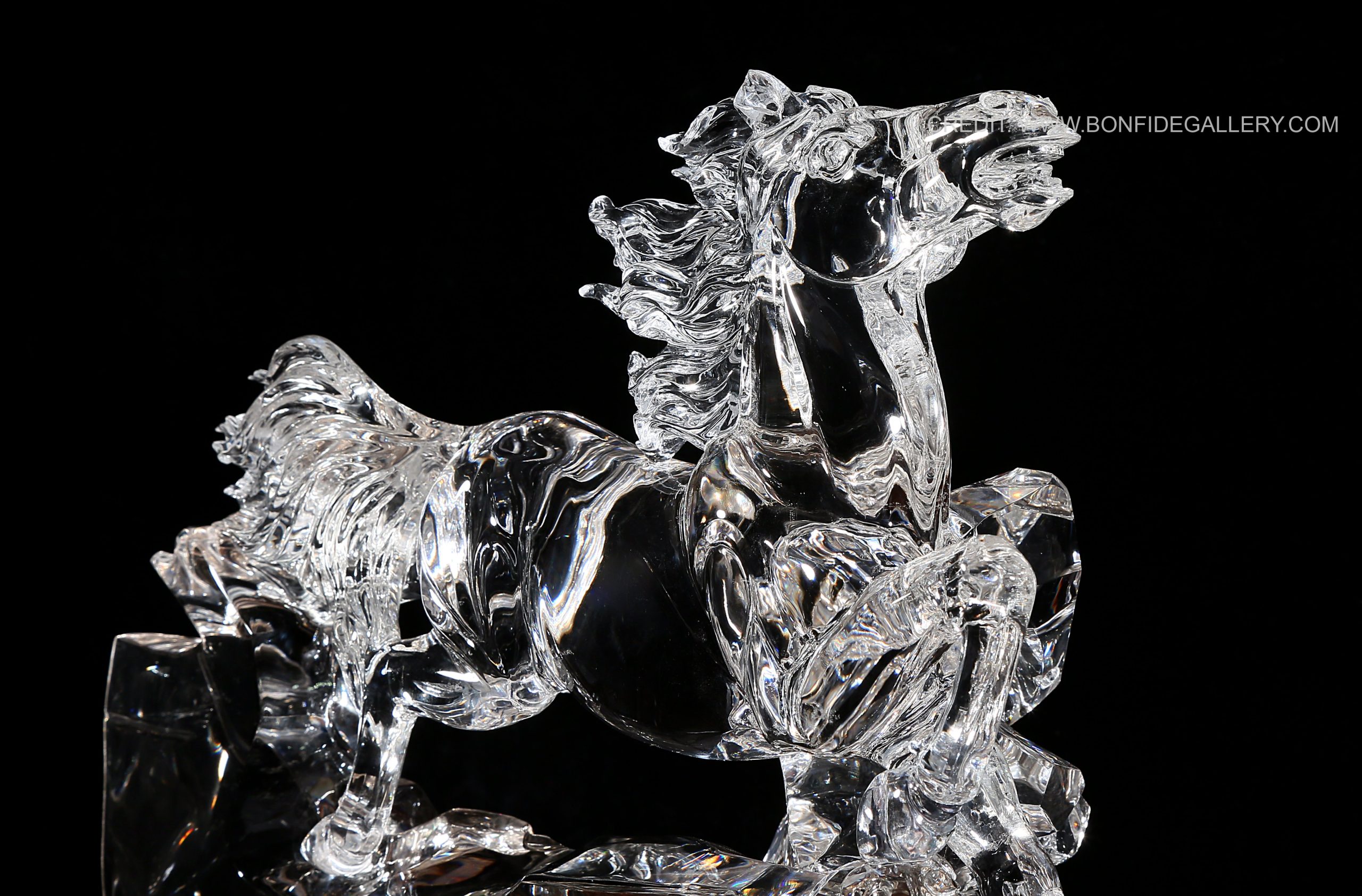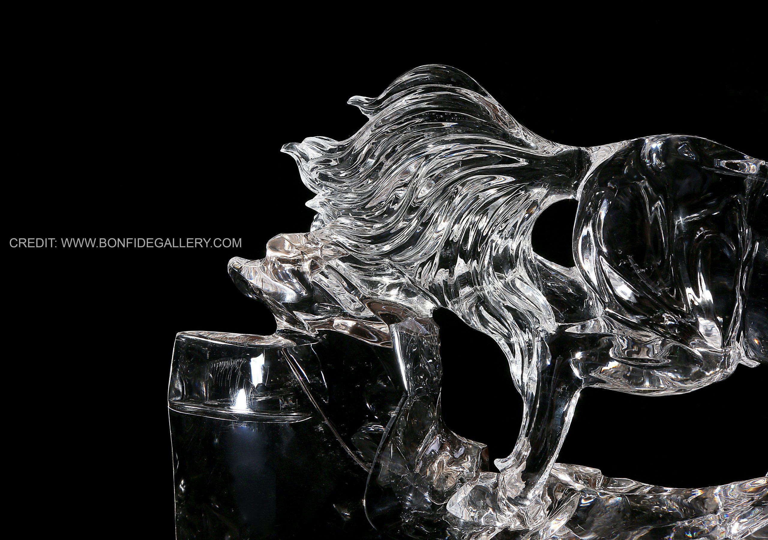 Beautiful Transparent Equine Dynamics. glass sculpture horse dynamic movement clear artistry contemporary art equestrian wood base sleek design